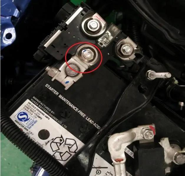 5、准备拆下电瓶正极桩头连接螺丝进行检查,结果发现螺丝内部丝口有损坏,不能拆下,后来客户承认,前几天在外加装氙灯时,安装人员拆过此螺丝,估计当时将螺丝拆坏了。