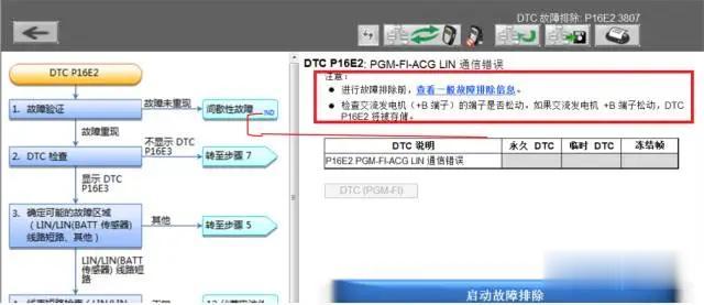 1、 使用 HDS 检查车辆各系统是否有故障码,发现 PCM 系统内储存有故障码:P16E2P——PGM-FI_ACG Lin 通讯错误。清除故障码后,过几秒, PCM 系统中仍出现 P16E2 这个故障。