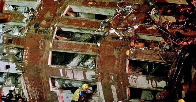 撞上的那一刻,大楼瞬间轰塌,场面惨不忍睹。