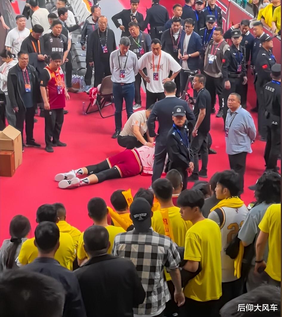 范子铭被吹了掩护犯规,大呼冤枉,而此时倒地的刘传兴则是双手抱头,十分痛苦,疑似是在摔倒过程中由于太过用力,磕到了后脑勺,这一下应该就是刘传兴赛后出现头晕目眩的原因,毕竟刘传兴身高226cm体重130kg,突然往后一个重摔,太玩命了,为了杀伤北京内线,大刘付出的代价十分惨重(希望赛后诊断没有大碍吧)。