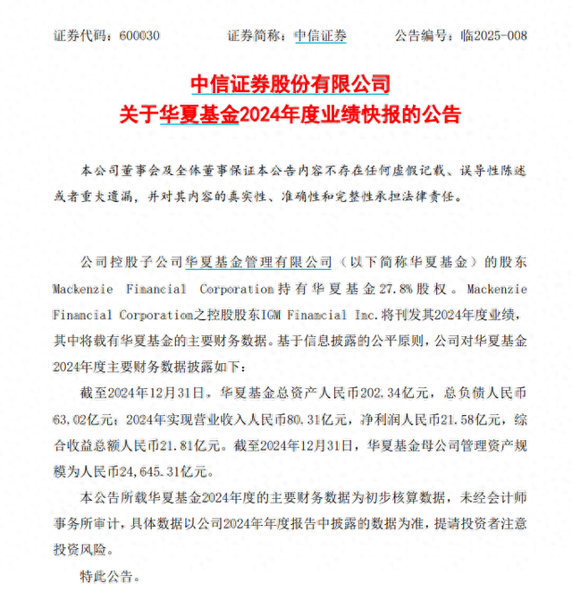 2月5日晚,中信证券(600030.SH;6030.HK)发布华夏基金2024年度业绩快报。未经审计数据显示,截至2024年12月31日,华夏基金总资产202.34亿元,总负债63.02亿元;2024年实现营业收入80.31亿元,净利润21.58亿元,综合收益总额21.81亿元。华夏基金母公司管理资产规模为2.46万亿元。