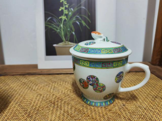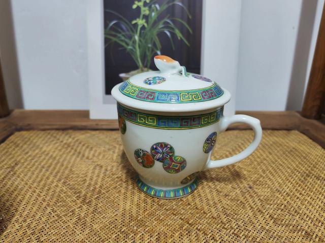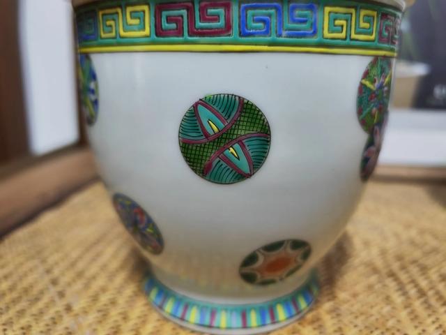 盖杯制作规矩,每个杯身绘制有十六个皮球花,盖子上绘有三个皮球花。杯口、杯底和盖子中圈,绘制回纹边,绘制工艺繁杂。