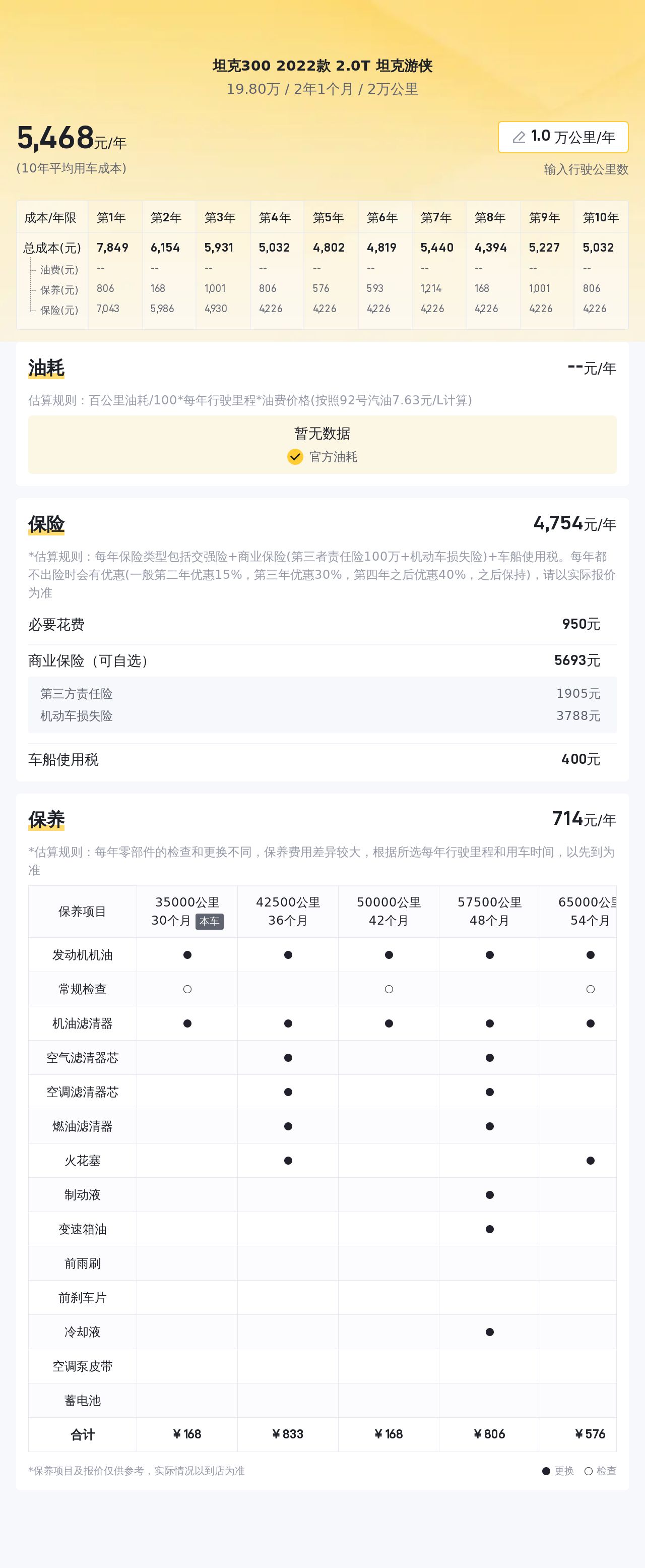 关于用车成本部分,保险每年大约5204元,保养每年大约2678元,油费大约每年14178元,这三项费用合计约每年22060元,每公里约合1.1元。车况信息需要线下结合车辆实际情况进行综合参考,以上数据仅供参考。