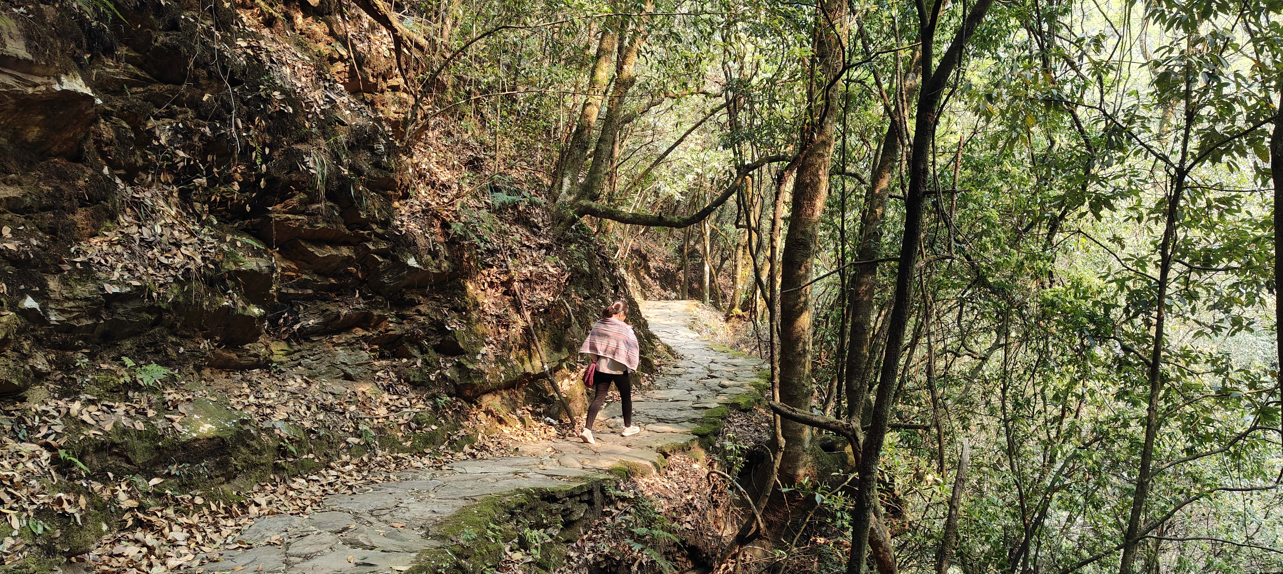 我们数着石阶上的马蹄痕向山脊攀行,八公里古道像条褪色的丝绸,在苍翠里忽隐忽现。转过崖角时,千家寨遗址的断壁猝然撞入眼帘。坍塌的土墙间探出几枝野山茶,粉白花瓣随风轻颤,恍惚间竟似瞥见古寨炊烟袅袅的光景。妻子掏出素描本勾勒轮廓,笔尖沙沙声里,八百年前的驮铃声穿透时空,在耳畔叮当作响。