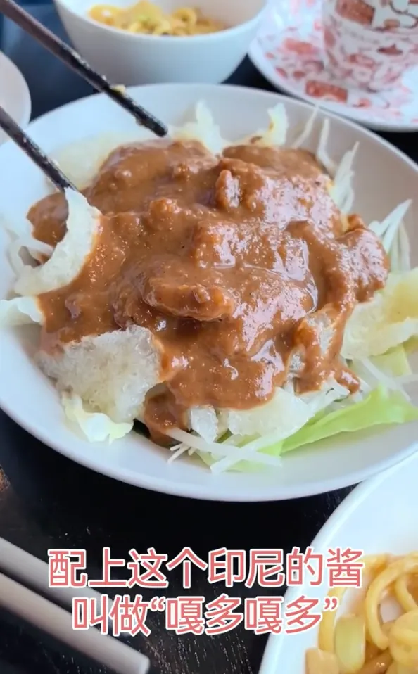 护工不会做印尼风味的炒面,他便和对方有商有量,细细说明里要加鸡蛋、羊肉、虾仁,才更好吃;吃比较油的面食,便配上一碟「嘎多嘎多」酱。