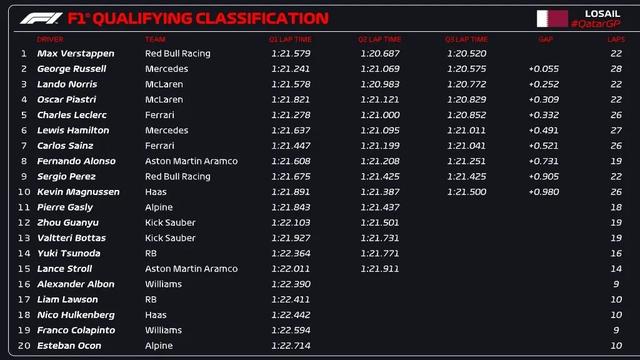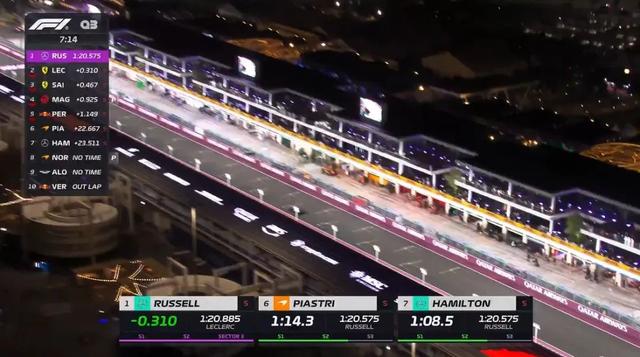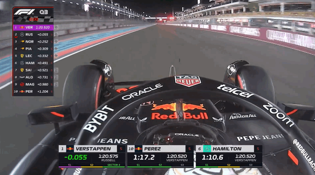 整场排位赛结束,维斯塔潘夺得杆位,拉塞尔将与维斯塔潘头排发车。诺里斯第三,皮亚斯特里第四。