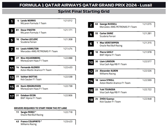 冲刺赛在前一天的冲刺赛排位赛中,诺里斯夺得杆位。拉塞尔稍稍落后,排在第二,与诺里斯同排发车。