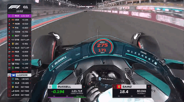 第一节排位赛Q1起表七分钟后,车手们已经陆续驶上赛道做出成绩,拉塞尔较早完成出色的一圈排在第一。