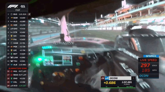 暂时位于淘汰区的车手是博塔斯、周冠宇、角田裕毅、斯托尔以及无成绩的阿隆索。