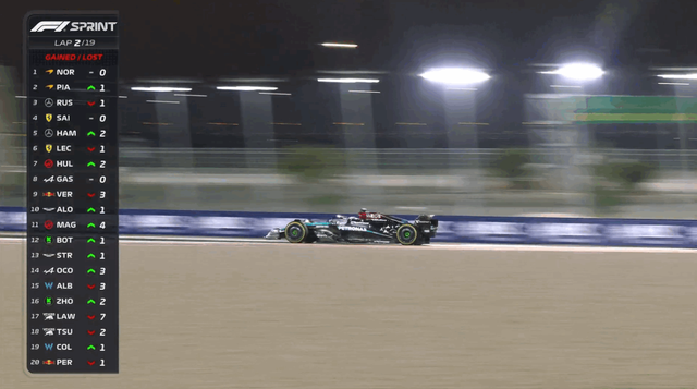这是一次顺利的发车,诺里斯守住了第一。但拉塞尔在1号弯选择了内线,出弯后被皮亚斯特里从外线超越。