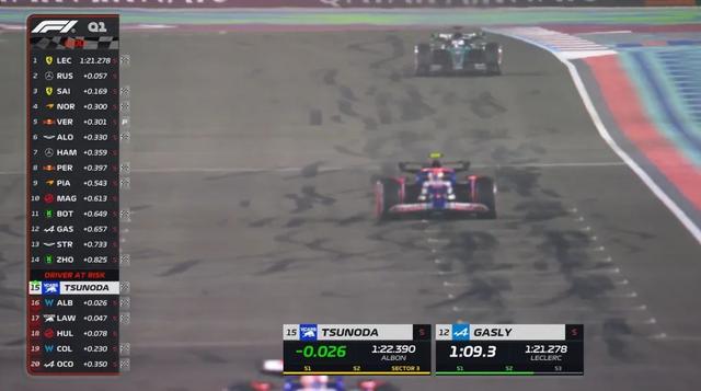 Q1最后一轮飞行圈中,劳森没有提升成绩,但角田裕毅却以第15名惊险晋级。拉塞尔又刷新了圈速。
