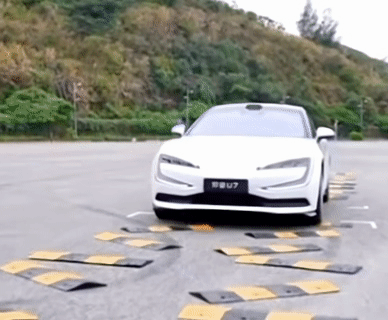 在不规则减速带、不规则坑洼路面测试中,仰望U7如履平地,只看到轮胎在上下跳动,车身丝毫不受影响!
