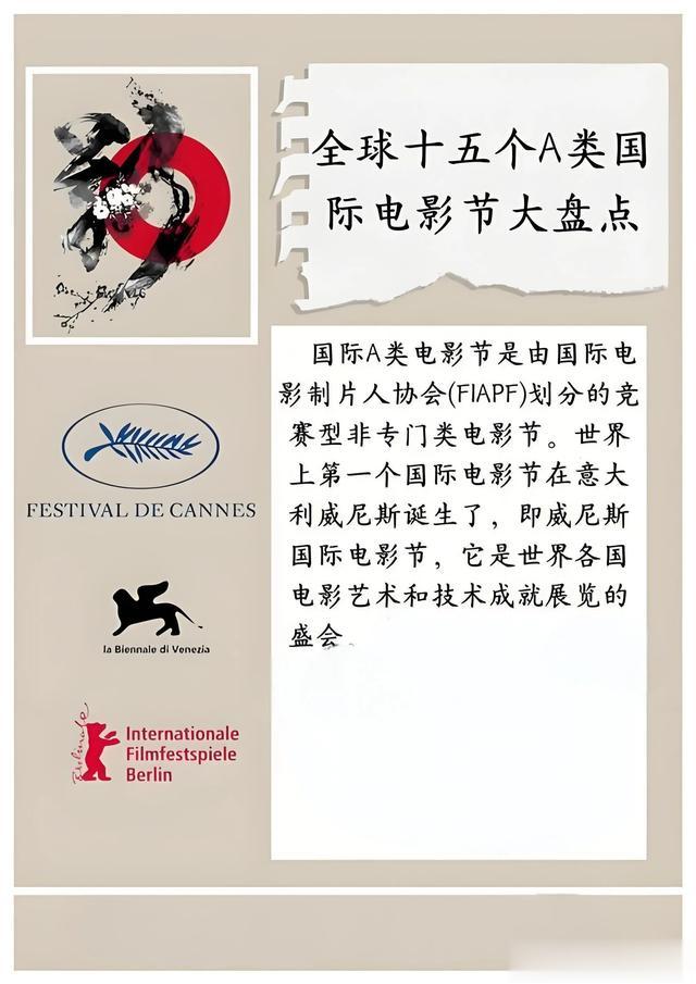 国际上有15个A类电影节,其中最早的是1932年开启的威尼斯电影节,最近的是1997 年开办的是塔林黑夜电影节。现在剩下14个,莫斯科国际电影节在2022年被剔除了(缘由众所周知)。