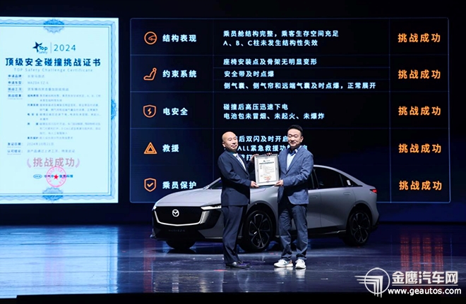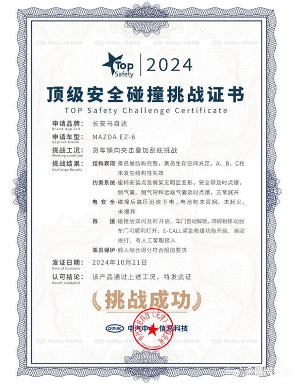 安全,是EZ-6传承马自达的核心DNA。本次发布会,长安马自达公布了EZ-6行业首次“货车横向夹击叠加刮底挑战”成绩。本次碰撞测试基于丁字路口大货车高速冲撞车身侧面,叠加车辆底盘电池包托底,最后撞向墙面的真实场景,挑战难度堪称“地狱级”。发布会上,中国汽车技术研究中心有限公司首席专家、中汽信息科技(天津)有限公司总工程师王军雷对本次碰撞测试做了深度解读,并向长安马自达汽车销售分公司执行副总经理吴旭曦颁发了“001号顶级安全证书”。