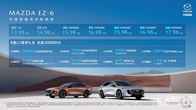 为进一步降低广大用户的拥车门槛,长安马自达此次推出了丰厚的购车权益:自上市之日起,购EZ-6可享8重EZ尊享礼包,至高30,000元:EZ焕新礼:10,000元至高增换购补贴;EZ安芯礼:7,999元终身零燃权益,不限车主,不限里程;EZ升级礼:5,000元选装基金,购买选装包立减;EZ补能礼:3,999元蓝牙充电桩(含安装);EZ畅玩礼:1,390元畅玩流量,基础流量终身免费,娱乐流量2年免费(10G/月);EZ护航礼:1,399元智驾护航保障,新车车主首年享至高600万元智驾保障;EZ拥车礼:699元拥车礼包(豪华TPE脚垫,精品钥匙礼盒);EZ金融礼:1.99%起年均费率,12-60期个贷。详情可咨询当地经销商或线上客服。
