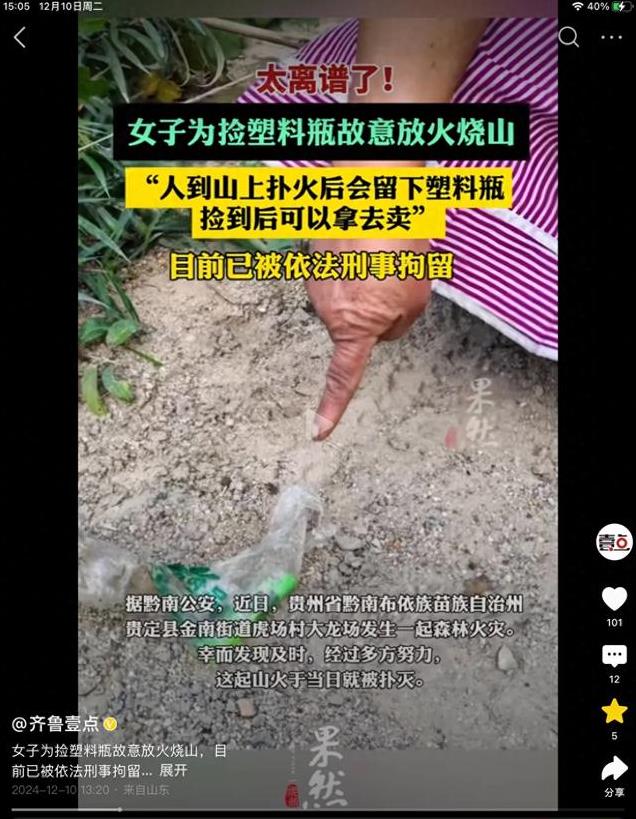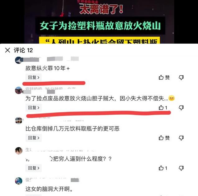 都知道现在入冬以后,到处都是风干物燥,特别是树林里面是很容易一不小心就会因为,一点点的火苗引发大火的,当地的一位中年妇女,平时喜欢捡塑料水瓶子来卖,铺贴一下生活费,但谁也没有想到,她突然不知道搭上那根神经,竟然主动引火烧山,她之所以这么做,竟然想到的是,火灾发生以后,肯定有很多人上山帮忙救火,而因为救火人要喝大量的水,她就想着这些人在喝完水以后,塑料瓶子肯定不要了,丢在山上,然后她就可以顺势捡来卖钱,就是因为这一点点的小钱,所以她决定放火烧山。