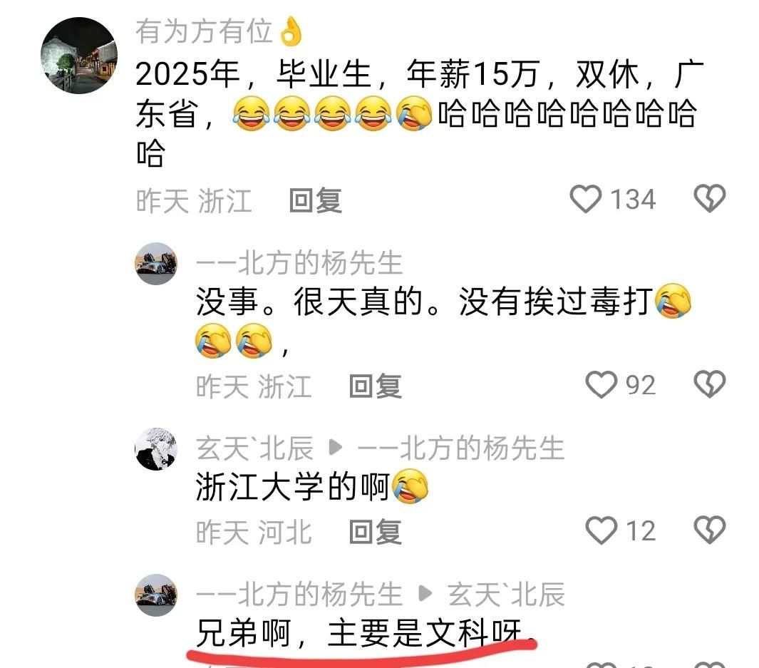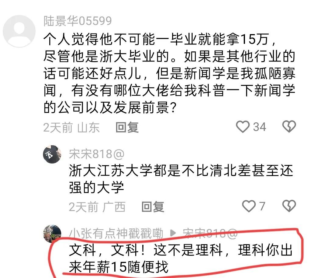 “可能现在的孩子对金钱还没啥概念,总觉得15万应该随便搞搞。可惜她是文科还是新闻学的,这刚出来就想拿这个数只能算做梦了。理科浙大出来的确实可以。”