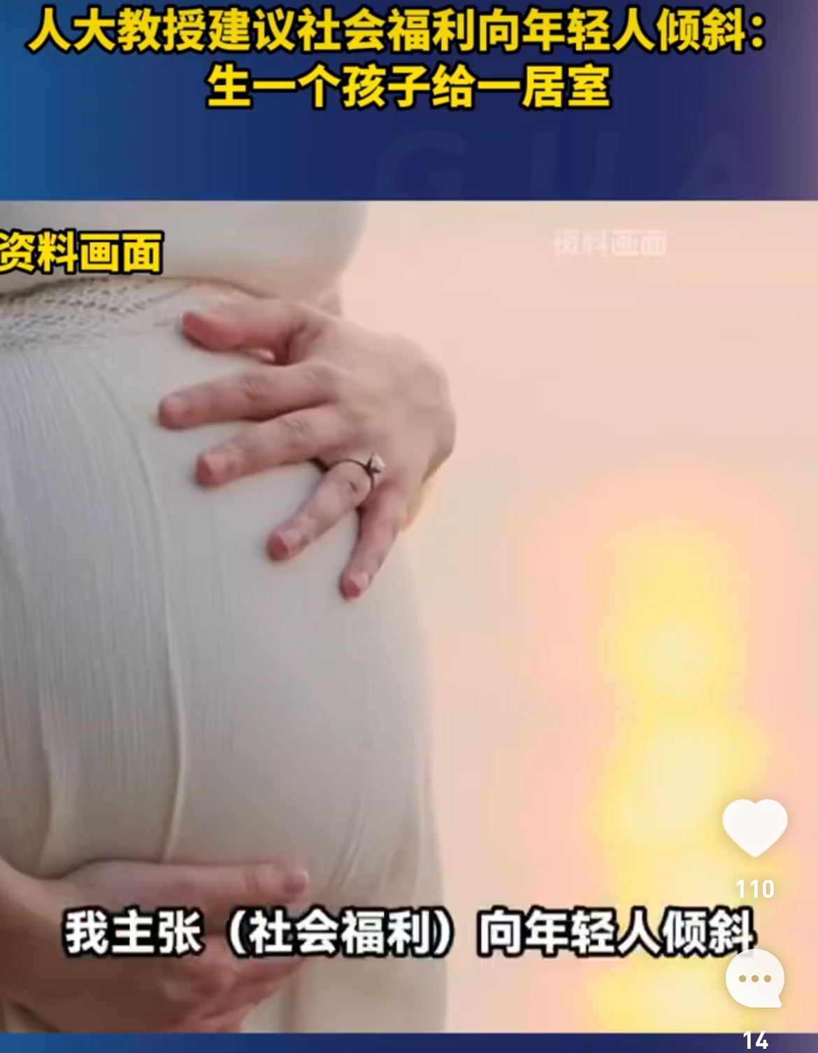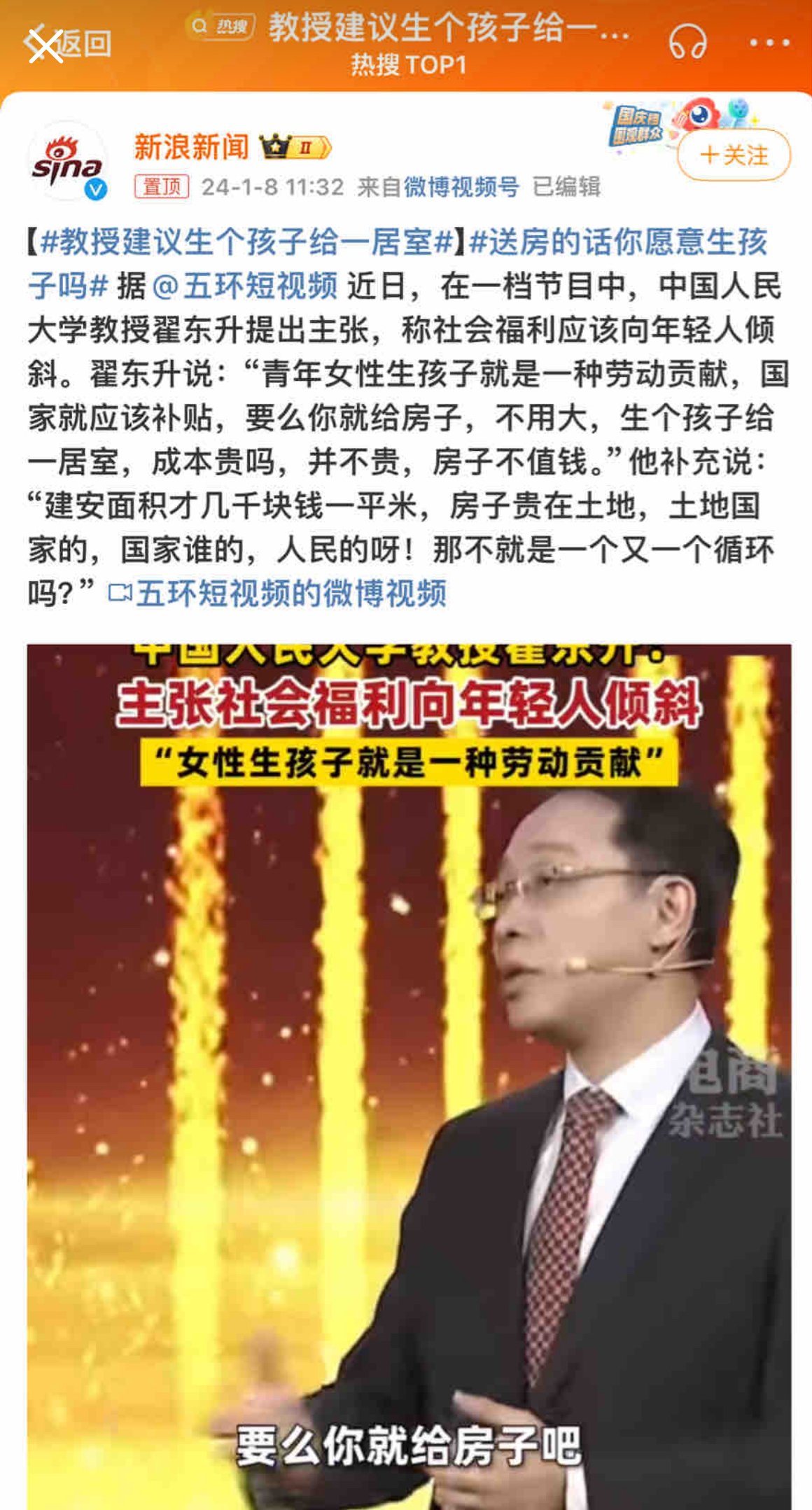 近日,在一档节目中,中国人民大学教授翟东升提出主张,称社会福利应该向年轻人倾斜。翟东升说:“青年女性生孩子就是一种劳动贡献,国家就应该补贴,要么你就给房子,不用大,生个孩子给一居室,成本贵吗,并不贵,房子不值钱。”他补充说:“建安面积才几千块钱一平米,房子贵在土地,土地国家的,国家谁的,人民的呀!那不就是一个又一个循环吗?”