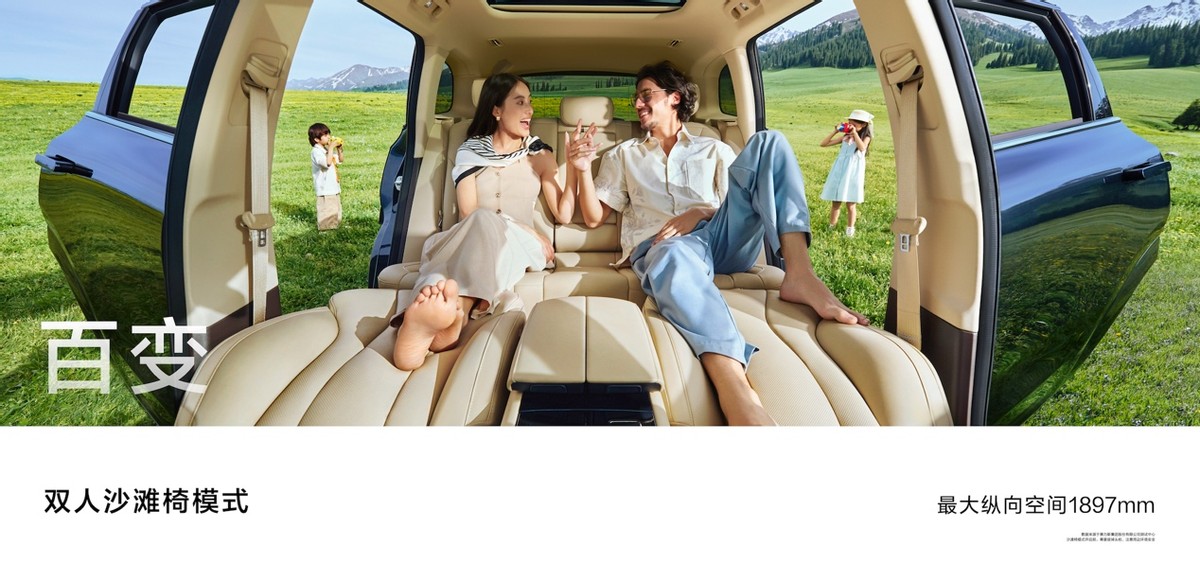 空间上,问界新M7 Pro采用百变魔力舒适座舱设计,五座版本拥有同级最大的3338mm车内有效空间,以及同级最大的一排、二排和后备箱空间。前排座椅靠背可向后放倒69°,形成双人小憩模式。拆除前排座椅头枕,与后排坐垫对接后最大纵向空间1897mm,实现双人轻松躺平的沙滩椅模式。一排、二排座椅还可组合3m×1.5m极致大空间,实现大平层模式。