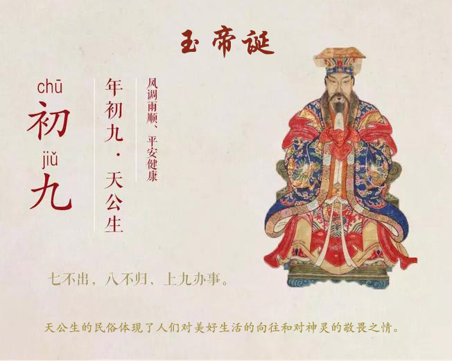 正月初九俗称“天公生”,又被称为天日节,玉皇诞。汉族传统农历节日之一。是天界最高神祇玉皇大帝的诞辰,天公就是玉皇大帝,是主宰天界最高的神,他是统领三界内外十方诸神以及人间万灵的最高神,代表至高无上的天。按照民间习俗来讲,要举行盛大的祭天仪式。向玉皇大帝祝寿,祈求新一年的风调雨顺,五谷丰登。这一天的汉族民俗,妇女多备清香花烛、斋碗,摆在天井巷口露天地方膜拜苍天,求天公赐福,寄托了汉族劳动人民一种祛邪、避灾、祈福的美好愿望。