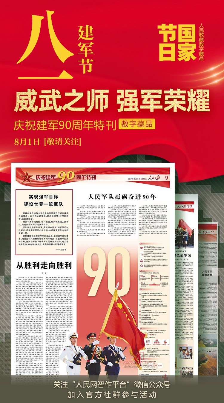 金戈铁马强军梦!值此八一建军95周年到来之际,人民网旗下人民数藏平台甄选典藏的自有超级IP《人民日报》2017年8月1日刊发的全彩版跨巨幅特刊《庆祝建军90周年特刊》,特别铸造为“强军荣耀主题数字藏品”。