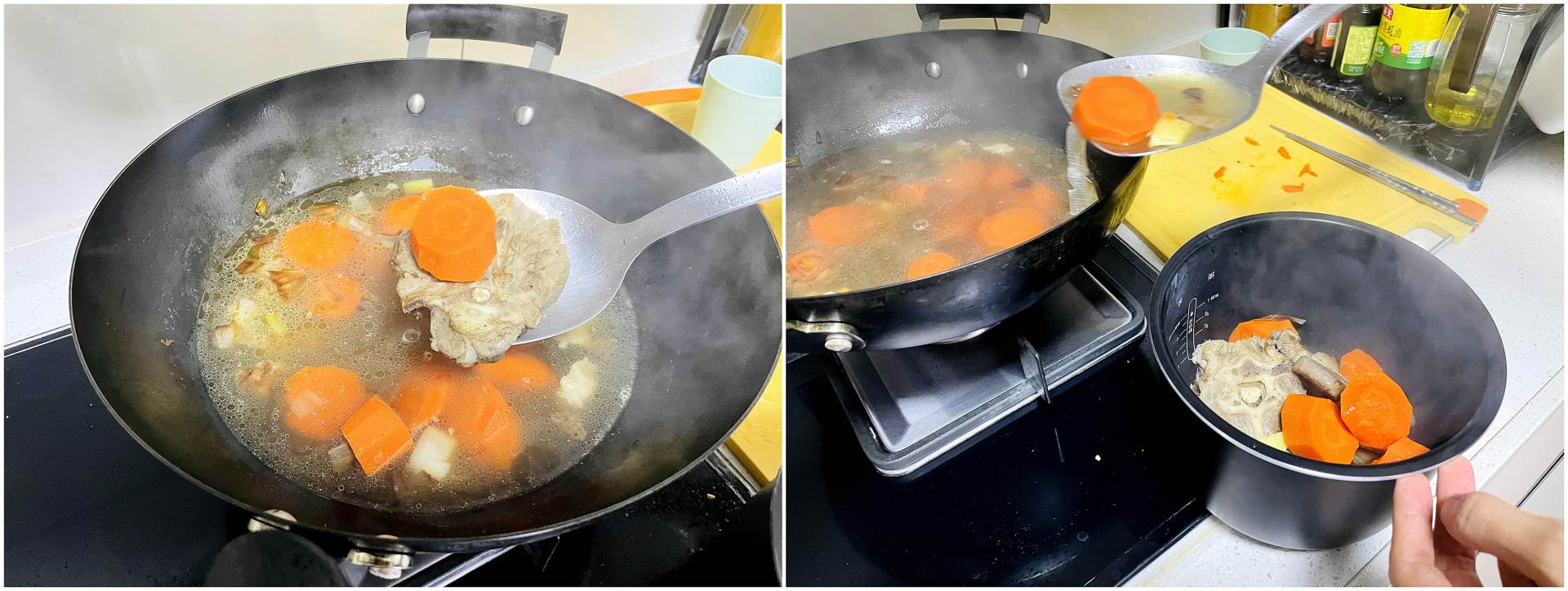 和过去使用紫砂煲炖汤相比,电压力锅的口感上几乎没有区别,但所需要的时间更短,经过高压蒸煮后的羊蝎子口感软糯,胡萝卜也很烂,真香