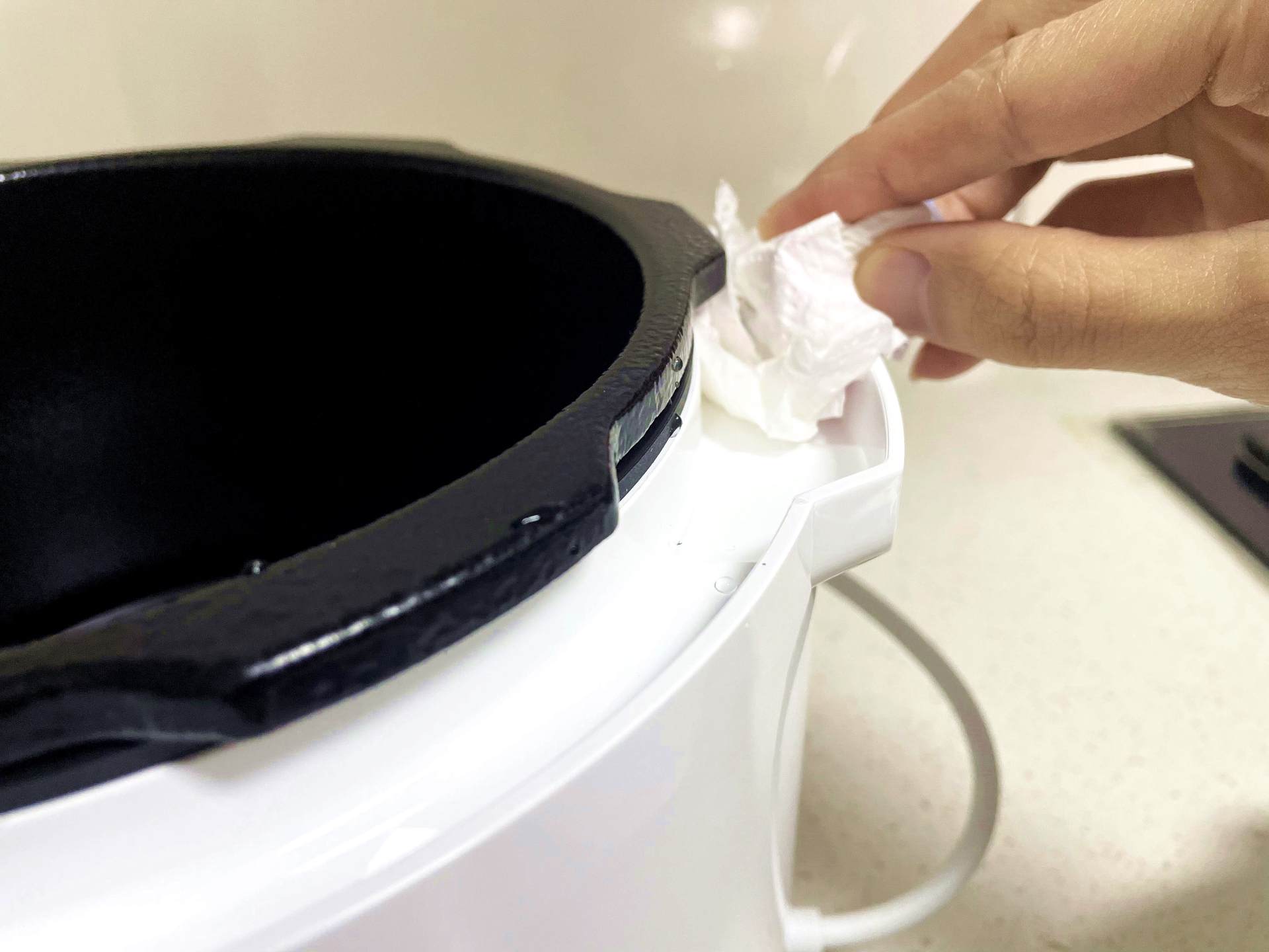 蒸饭结束后的锅底,可以看到几乎没有什么锅巴,洗碗时只需要用清水浸泡,轻微擦拭就能打理干净