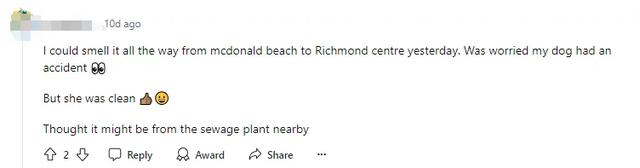 “昨天遛狗时,我从McDonald Beach到列治文中心一直能闻到这个味儿。还以为是狗子拉了,事实上她没有啊。可能是污水处理厂的问题”