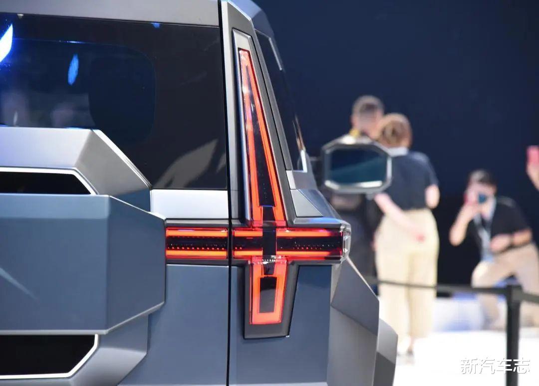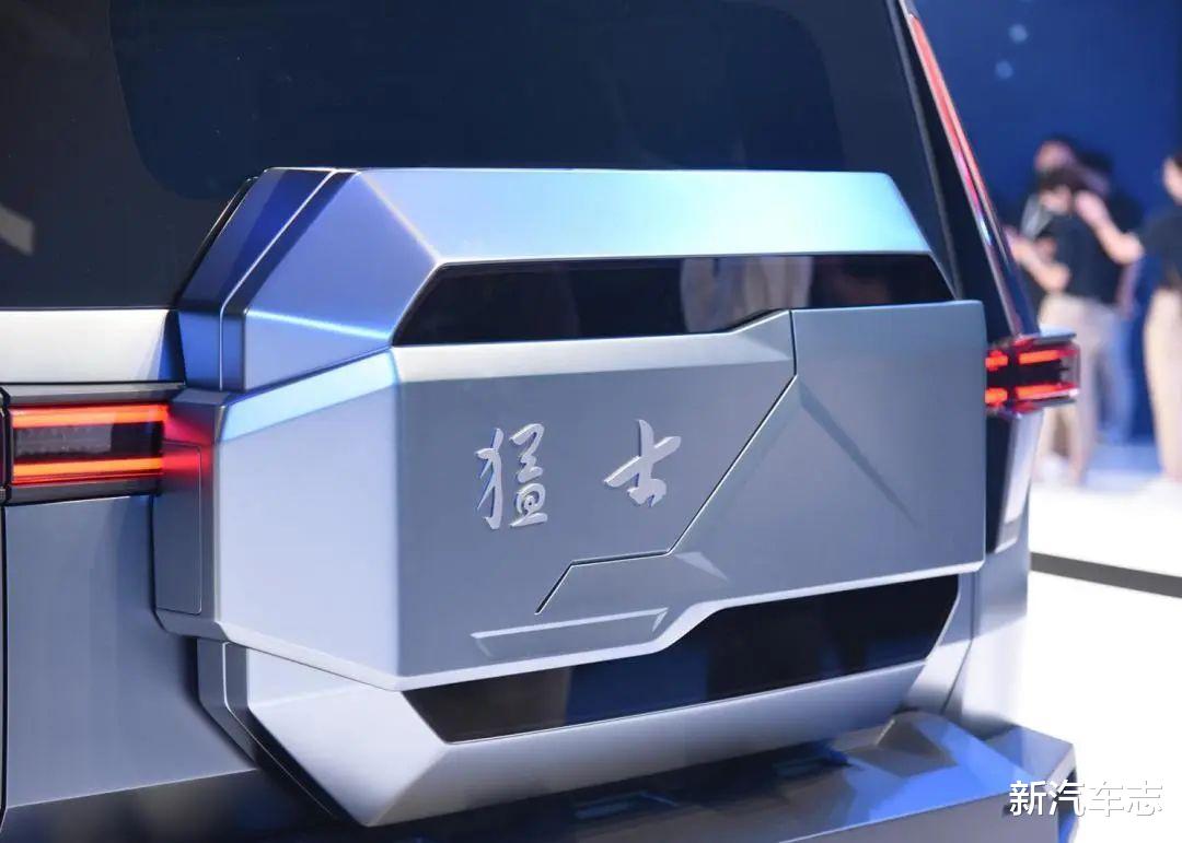 概念车车尾部分采用一个小溜背式的造型,车尾变成半开放式,尾灯和示廓灯十字交叉,车尾带有猛士的中文车标。据了解车身长度超过5.2米,从车身高度来看至少在2米以上,宽度预计也要超过2米,车重3.1吨,未来量产车可能要告别不少地库了。