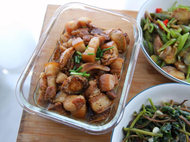 红烧肉还是用五花肉做的香,今天的五花肉肥肉略微多一些,于是我加了一些鲍鱼一起烧,这样做出来的红烧肉吃起来更加鲜美,五花肉先切成合适的块,鲍鱼去壳去内脏,刷洗干净后和五花肉一起焯水,捞出沥干水分,锅中不放油烧热,下入五花肉,煸炒出五花肉的油脂,然后下入冰糖碎,姜片,八角,桂皮,香叶,炒出香味后加入鲍鱼,老抽,生抽,蚝油,少许盐,适量清水,煮开后转入高压锅,压20分钟,然后倒回炒锅里大火收汁即可出锅,装盘后可以来点小葱增香增色。