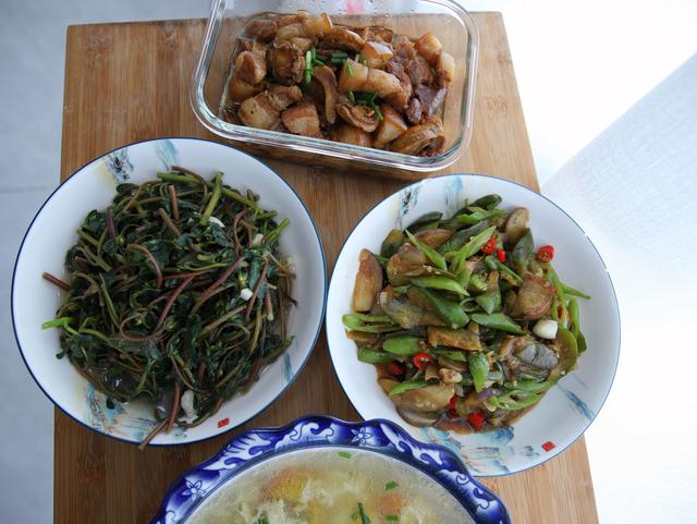 晒晒今天的晚餐:西红柿鸡蛋汤,辣椒炒茄子,蒜蓉马齿苋,鲍鱼红烧肉。