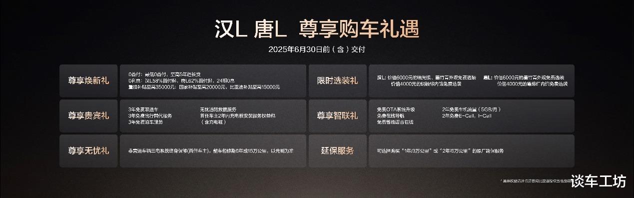 伴随汉L唐L的上市,比亚迪王朝网还准备了七重购车礼遇。截至6月30日24:00前完成购车开票,用户可享尊享金融礼,0首付、0利息任选其一;尊享置换礼,置换补贴至高35000元;还有尊享无忧礼、尊享贵宾礼、尊享智联礼、延保服务可选。