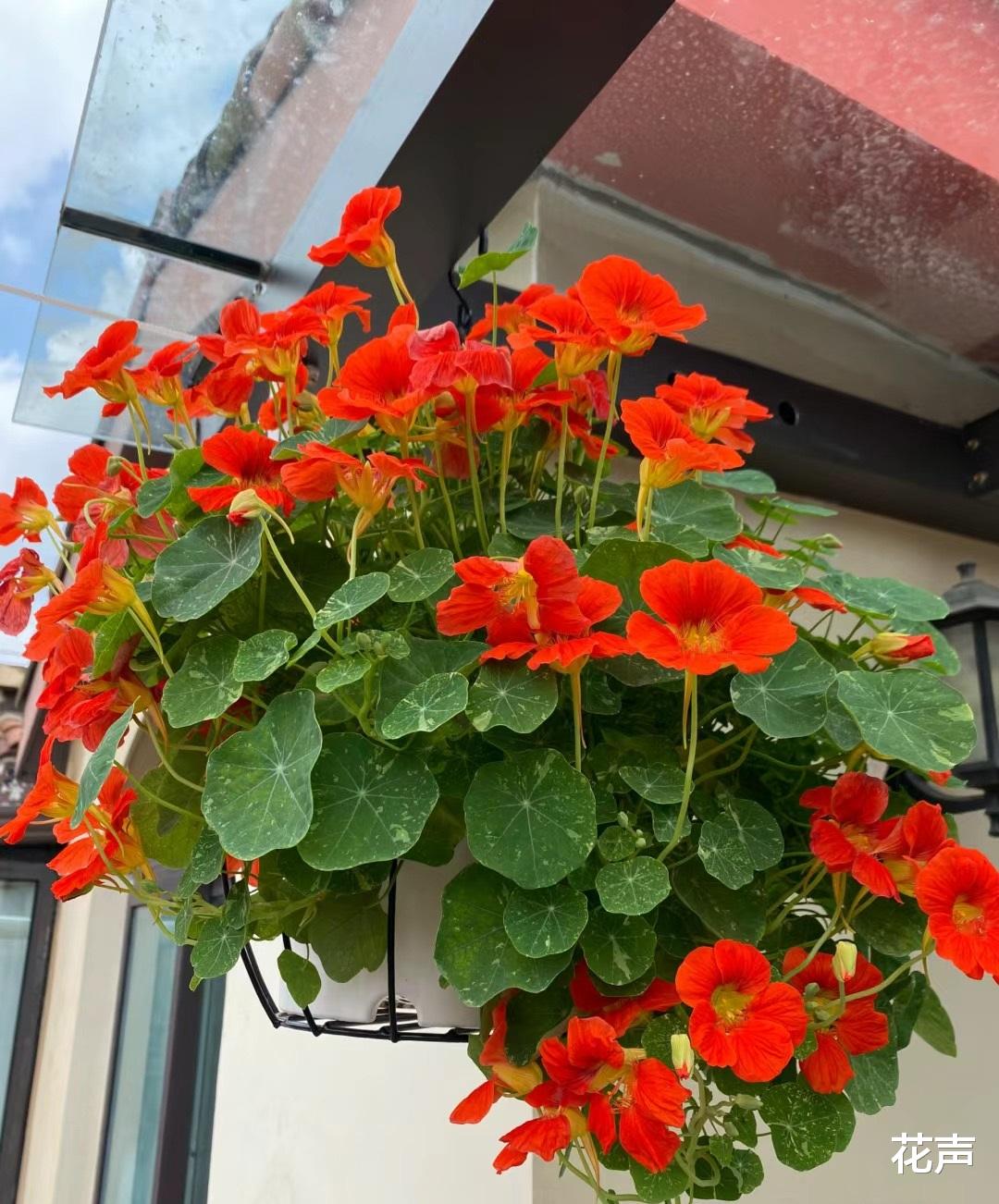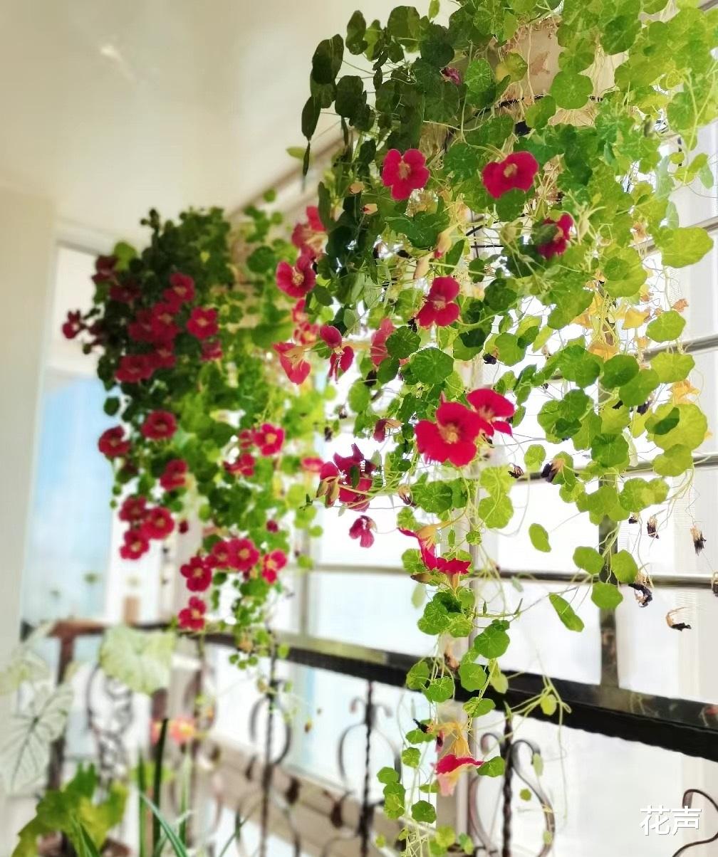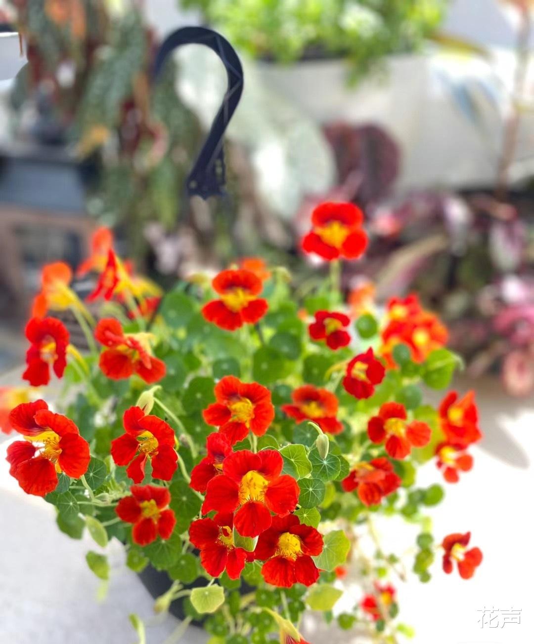旱金莲原产于南美,现世界各地广泛栽培,有诸多园艺观赏品种,多年生蔓性草本,其植株形态飘逸美丽,株高能长到两米近三米,有一定的藤性,分枝性很好,株型浑圆紧凑,一株就可以长成一面小花墙,特别适合做垂吊盆栽,挂起来让枝条自然垂落,株型像瀑布一样,只需要一棵,就能长成花瀑布形态。