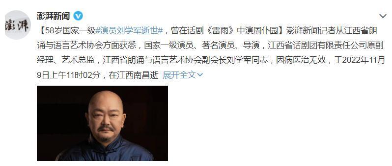 老艺术家们留下了经典的作品,在整个演艺圈之中也是相当的低调,不愿意看到这一类的现象发生,真的不希望接连听到这样的噩耗。希望刘学军一路走好,天堂里没有病痛。