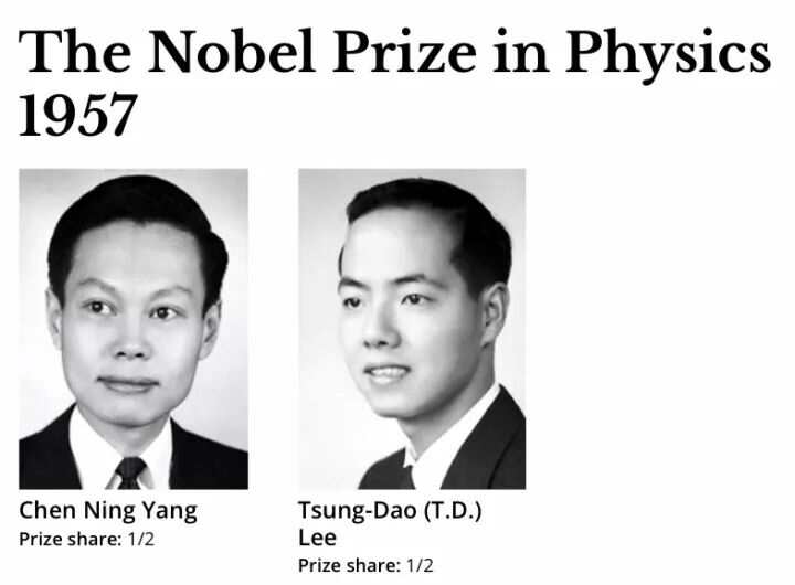 1957年,杨振宁和李政道因为“宇称不守恒”的科学成果,获得了诺贝尔物理学奖。