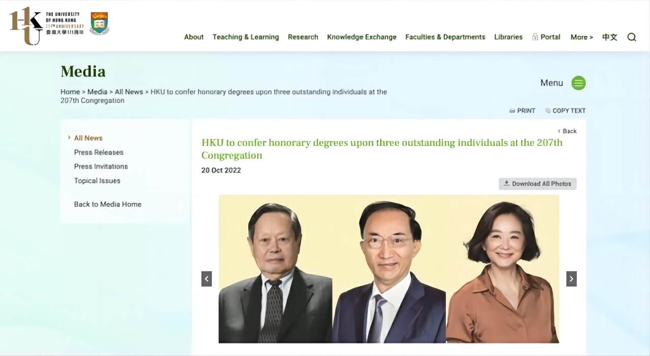 一同荣获该奖项的还有朱棣文教授、演员林青霞、林高演博士等人,表彰他们对本科、社会或学术方面的杰出贡献。
