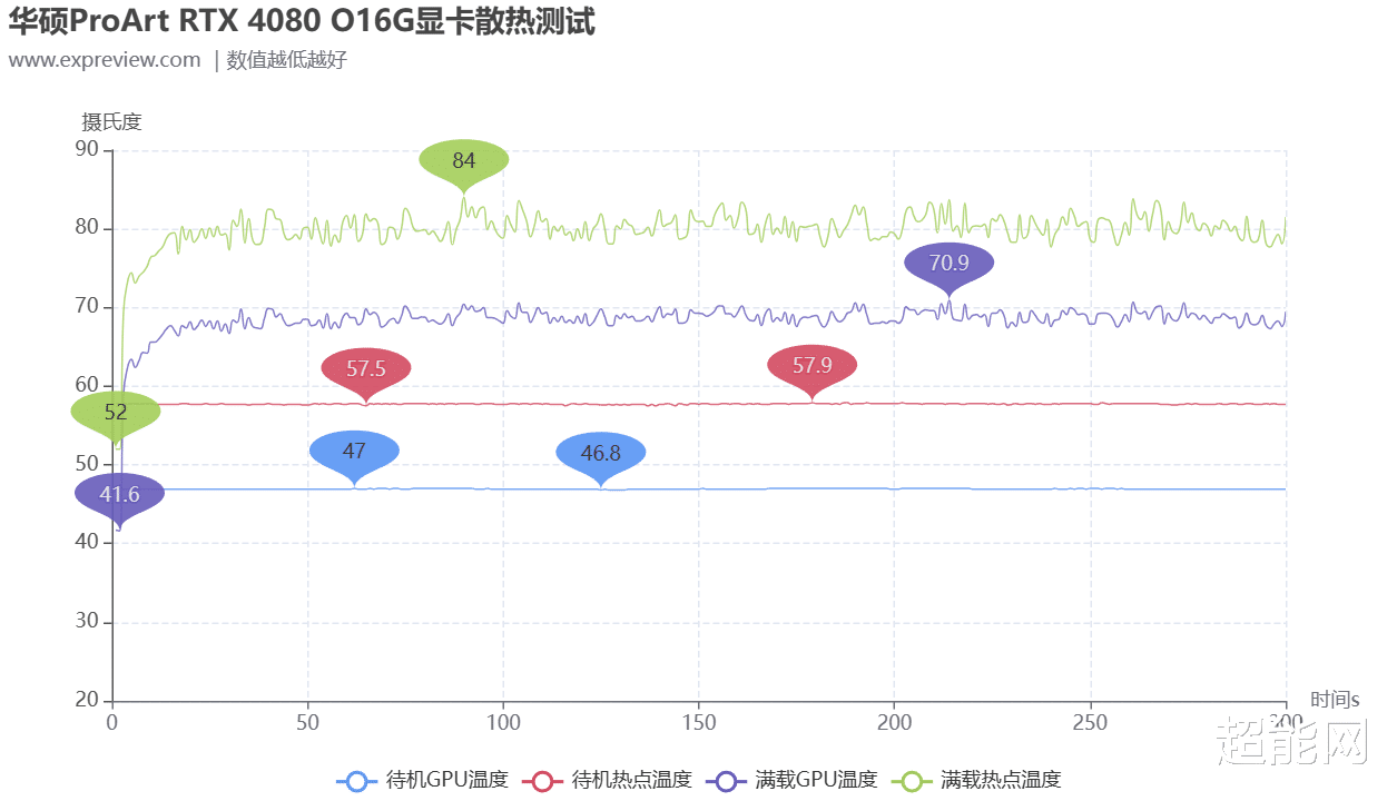 满载状态下,该卡GPU最高温度仅仅才只有70.9℃,并不算高,关注最热点温度的话,也最高才84℃,华硕ProArt RTX 4080 O16G显卡厚度比其他RTX 4080要薄,但它的散热表现依然相当不错。所以待机状态下全靠被动散热。经过5分钟的待机测试,显卡的待机温度在47℃以内,属于很清凉的范畴,热点温度也不到58℃。