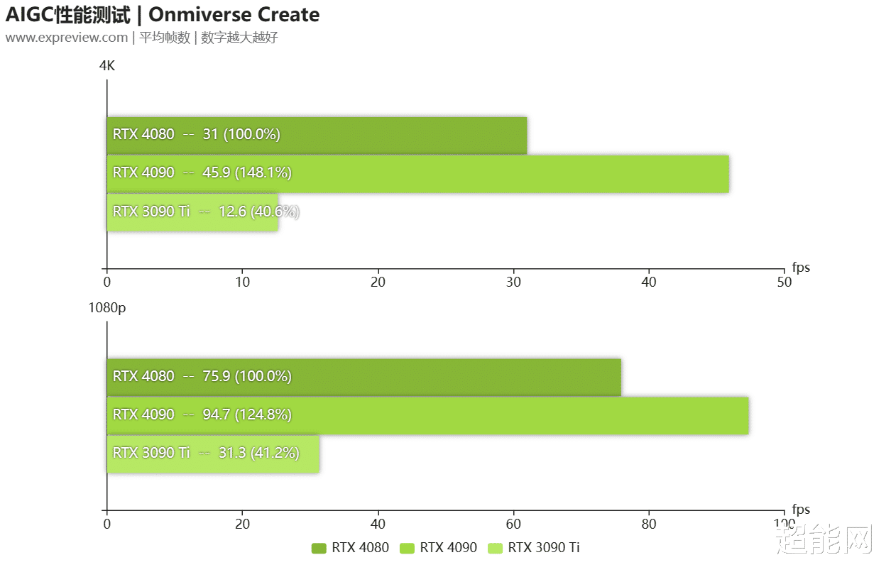在3D渲染类工作,RTX 4080相比上代旗舰RTX 3090 Ti有非常大的提升,渲染能力有20-30%的领先,当然了和这代旗舰RTX 4090差距还是挺明显的,两者的定位差距摆在那里。