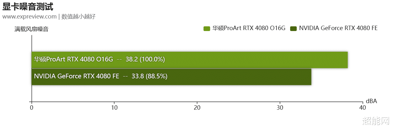 在消音房中华硕ProArt RTX 4080 O16G所测得的噪音是38.2dBA,比公版卡要高,其实在缩小散热规模的时候想确保散热性能,也只有提高风扇转速这条路,不过这显卡的噪音值只是相对高而已,实际上在静音室听起来风扇声也不是很明显,在外面跑烤机时甚至觉得它很安静。