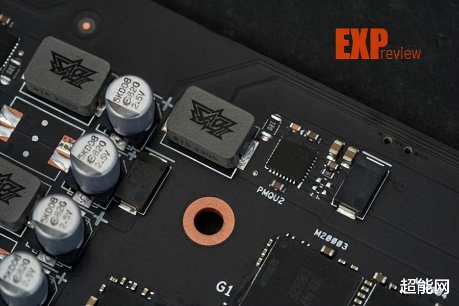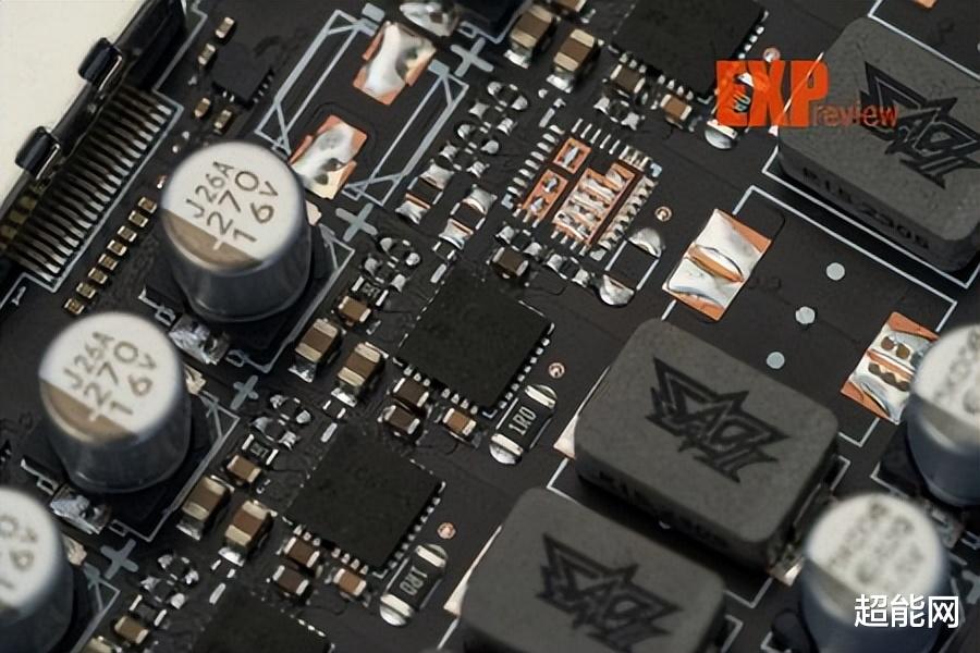 华硕ProArt RTX 4080 O16G显卡的PCB其实十分短,组件和布线都有针对短PCB优化,显卡采用13+3相供电设计,其中核心供电为13相,显存供电为3相,核心供电MosFET都是 威世半导体SiC654,最大持续电流为50A,10毫秒内峰值电流可达70A,10微秒内峰值电流则达到100A,GPU供电由uP9512R PWM芯片控制,显存供电位于GPU三个角上。