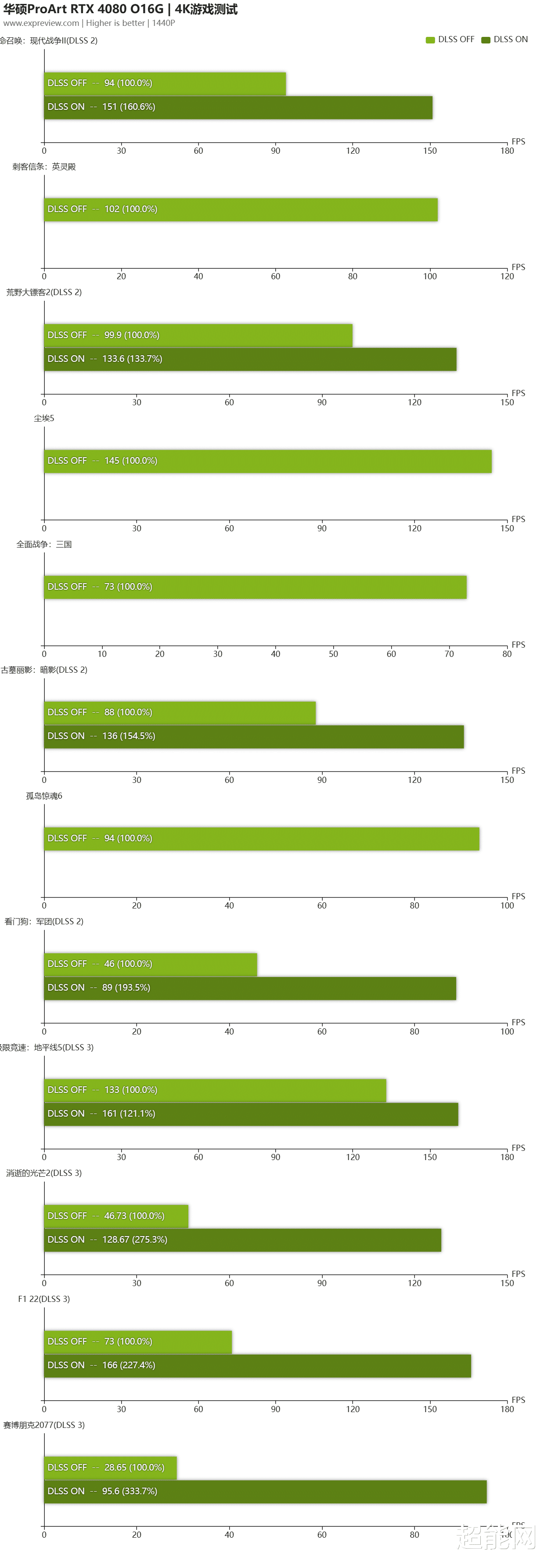 游戏性能测试我们测试了在4K分辨率下华硕ProArt RTX 4080 O16G的游戏性能,全部游戏都是开启最高画质,有光追的全打开,当然《赛博朋克2077》没有开启过载模式,会分别测试游戏开启DLSS和关闭时的帧率,测试时DLSS全部使用平衡模式,游戏如果支持帧生成的话会开启。