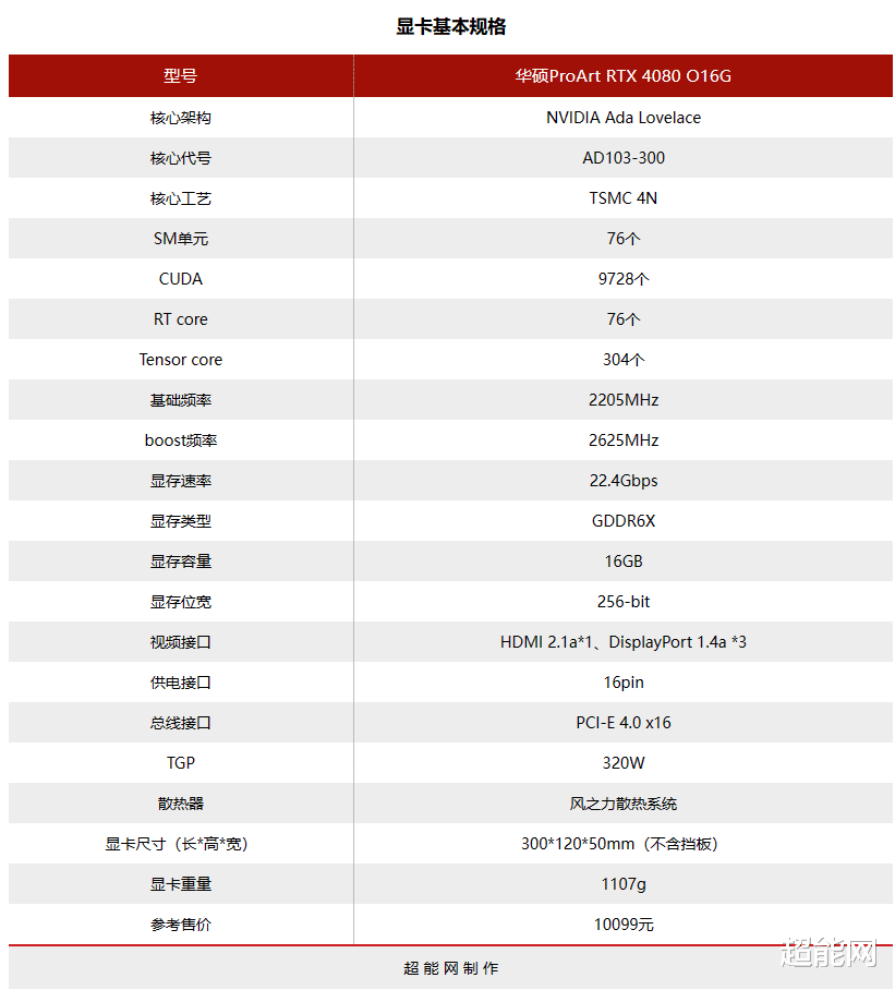 华硕ProArt RTX 4080 O16G的尺寸为300*120*50mm,和其他RTX 4080相比确实小一圈,低于3槽的RTX 4080确实很少,它的频率设定上要比公版高一些,核心基础频率维持2205MHz不变,Boost频率从2505MHz拉至2595MHz,配置有256bit/16GB GDDR6X显存,显存数据频率为22.4Gbps,采用16pin供电接口。