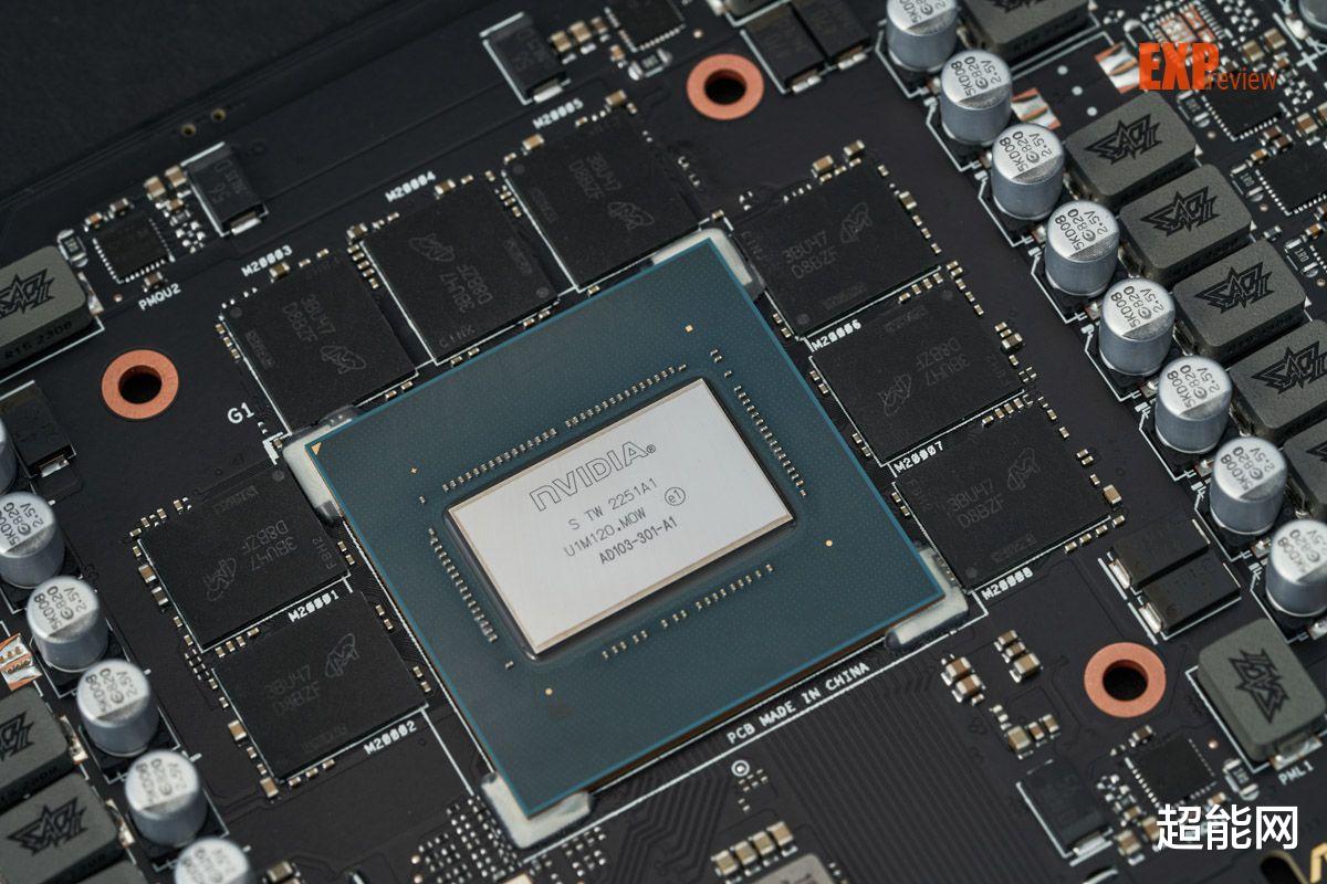 显卡采用AD103-301 GPU,它的显存位宽为256bit,所以它的旁边布置了8颗显存,这些都是美光的GDDR6X,传输速率22.4Gbps,总显存带宽716.8GB/s。