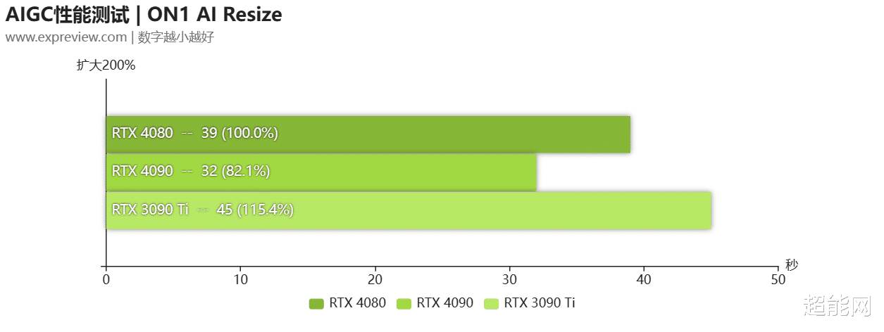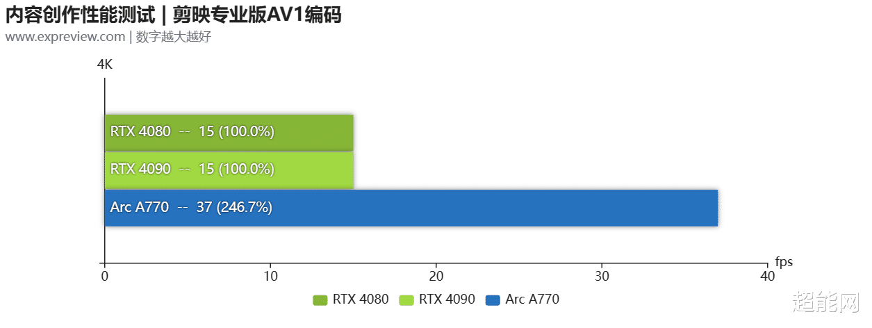 AV1编码测试可以看到RTX 4080和RTX 4090是同一水平,两者是相同的(DaVinci中2s内的差距算是测试误差),凭借着双编码器,无论是RTX 4080还是RTX 4090相比Arc A770都有大幅的领先,剪映中的耗时更是只需Arc A770四成的耗时。