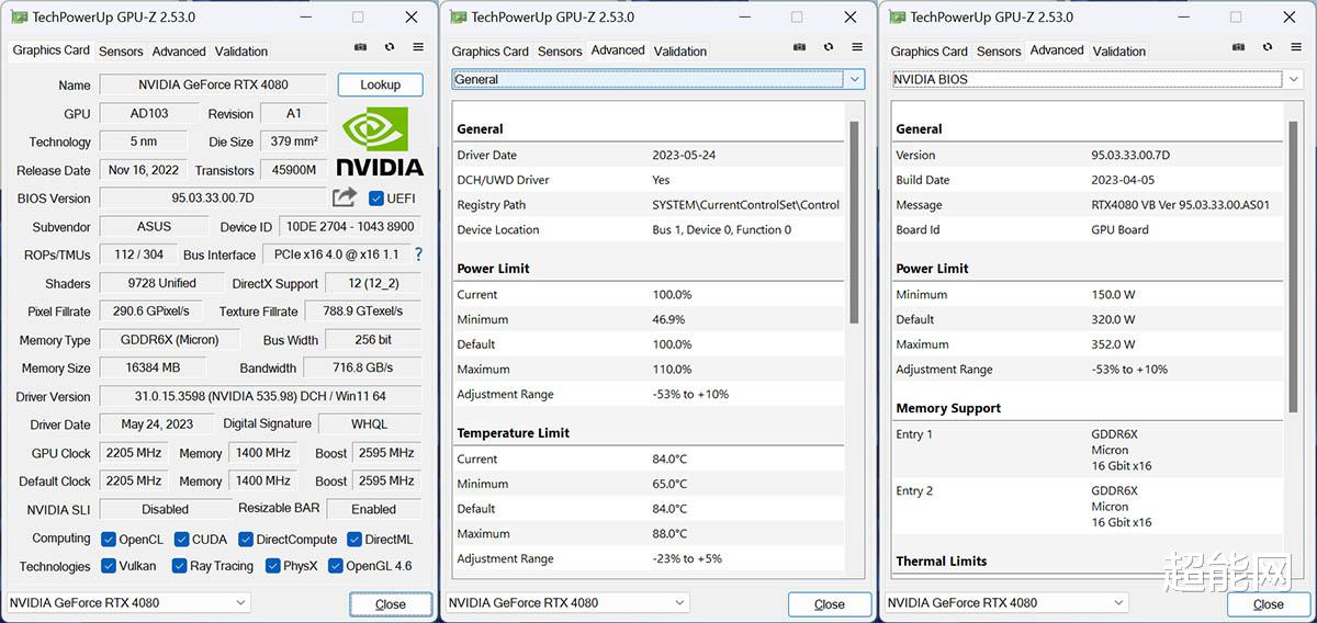 GPU核心基础频率是2205MHz,Boost频率2595MHz,显存等效数据频率22.4Gbps,功耗上限是320W,并且可以解锁至352W,默认温度上限是84摄氏度,可以向上解锁至88摄氏度。