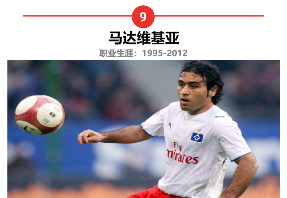 梅赫迪·马达维基亚是阿里·代伊后第二位拿到亚洲足球先生的伊朗球员,长期活跃于欧洲赛场,尤其在德国德甲效力多年,成为伊朗球员在欧洲足坛最成功的代表之一。他最辉煌的时期是在汉堡度过的,他曾荣膺德甲助攻王,并赢得德甲联赛杯。此外,他还曾代表伊朗国家队出战两届世界杯(1998、2006),是伊朗黄金一代的核心球员之一。