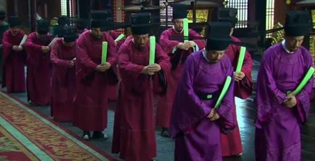 在早朝时,百官排列整齐,根据官阶高低分成两列站立。