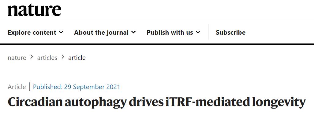2021年9月29日,美国哥伦比亚大学欧文医学中心的研究人员在国际顶尖学术期刊 Nature 上发表了题为:Circadian autophagy drives iTRF-mediated longevity 的研究论文【1】。