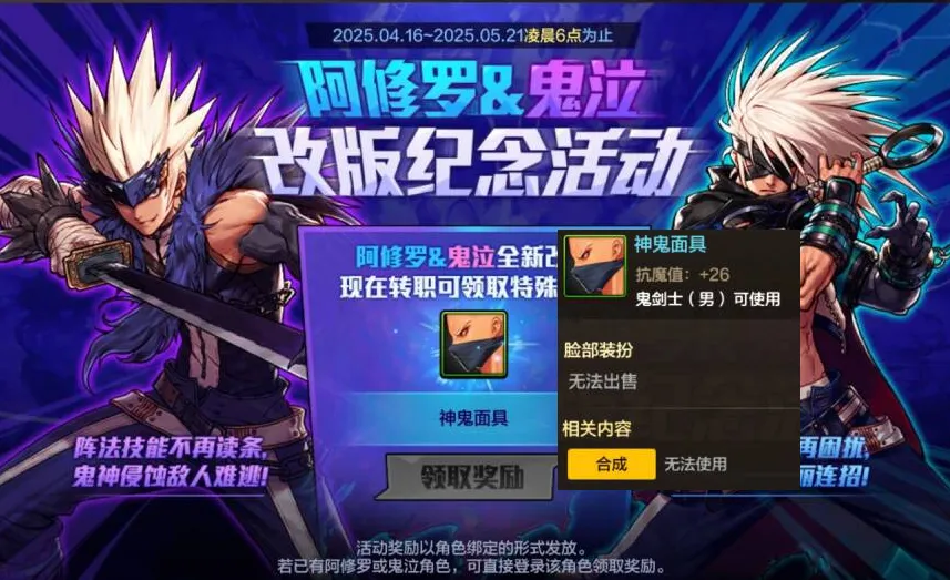 转职成修罗或鬼泣、或者现有修罗或鬼泣,可领取一个脸部装扮。