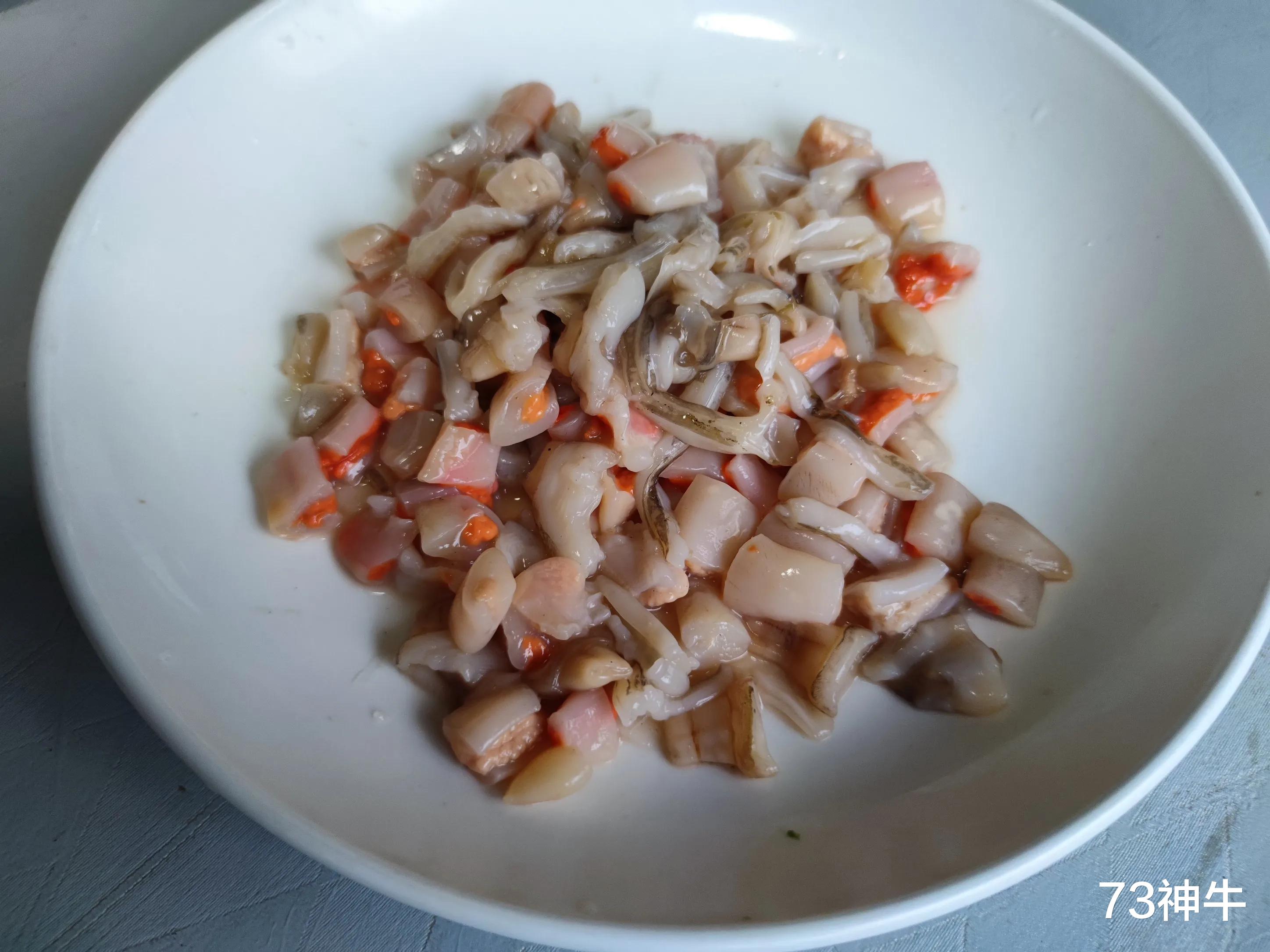 1.偏口鱼清洗干净,去除鱼鳃、鱼鳞和内脏,八爪鱼挤去眼睛和牙齿,翻转头部摘除里面的内脏和墨囊。